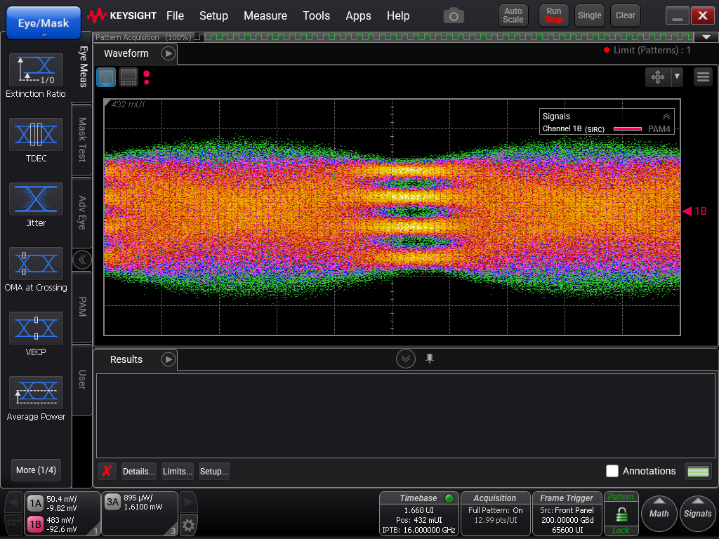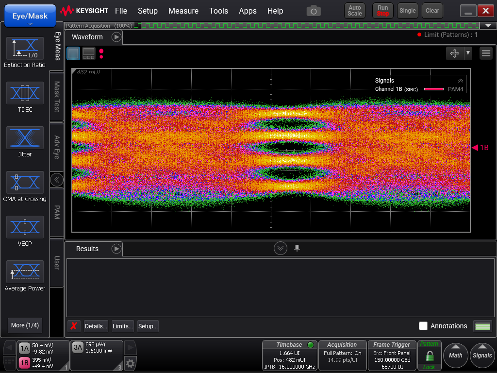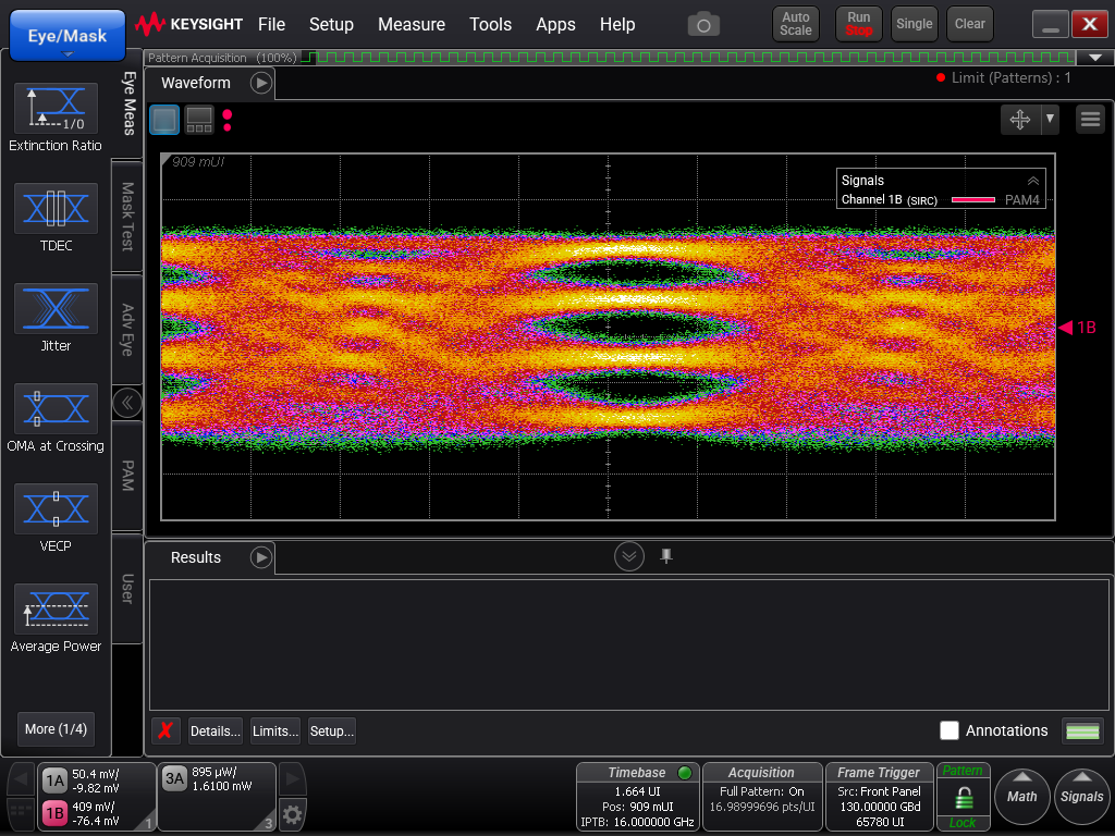 The SHF T854 A amplifier has been fed with a signal from a Keysight M8199B 256GSa/s AWG (SSPRQ Pattern). A Keysight DCA N1000A with Precision-Timebase & 122 GHz Sampling Module (N1046A) took the waveforms after an “in-system” calibration of AWG and Scope.